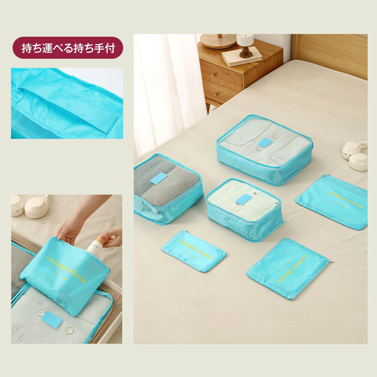 旅の荷造りをスマートに整える、荷造りがもっと快適になる、6点セットのトラベルポーチ。