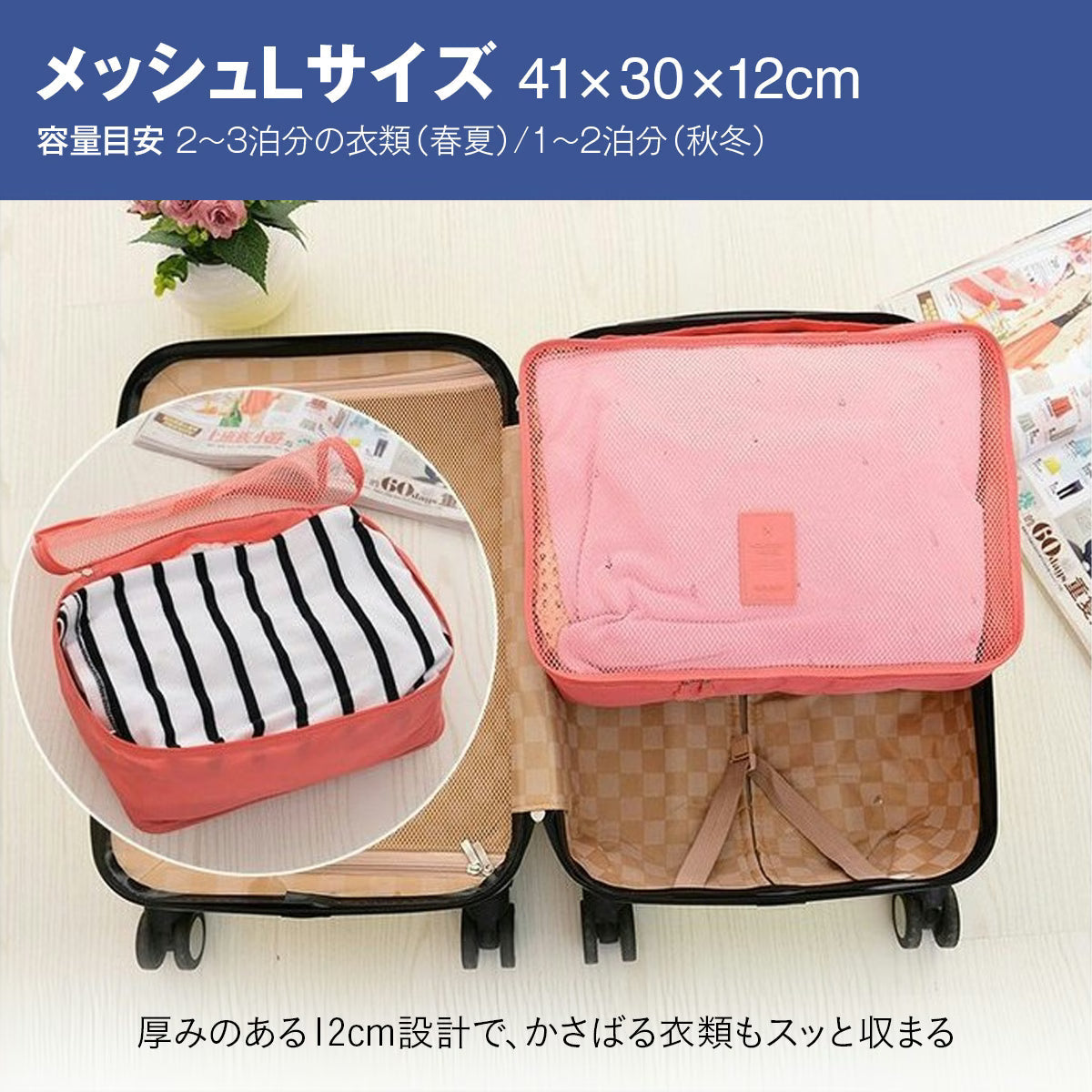 衣類や下着、小物をサイズ別に整理できる豊富なバリエーション。メッシュタイプと目隠しタイプを使い分けて、中身も一目で分かりやすく。旅の荷造りと荷ほどきがスムーズになります。