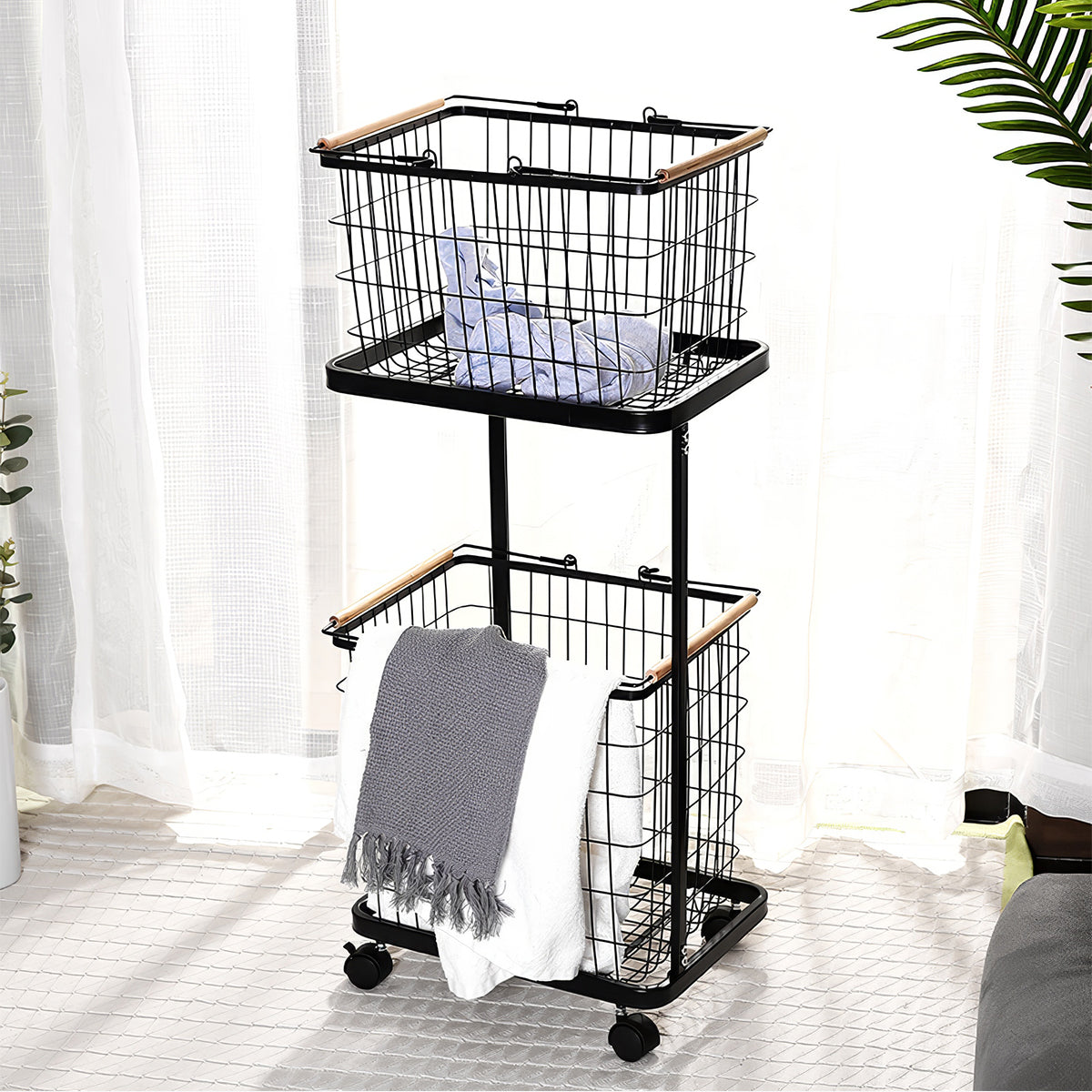 ランドリーバスケットワゴン 2段|キャスター付きで移動ラクラク 大容量ワイヤーかご 洗面所の省スペース収納
