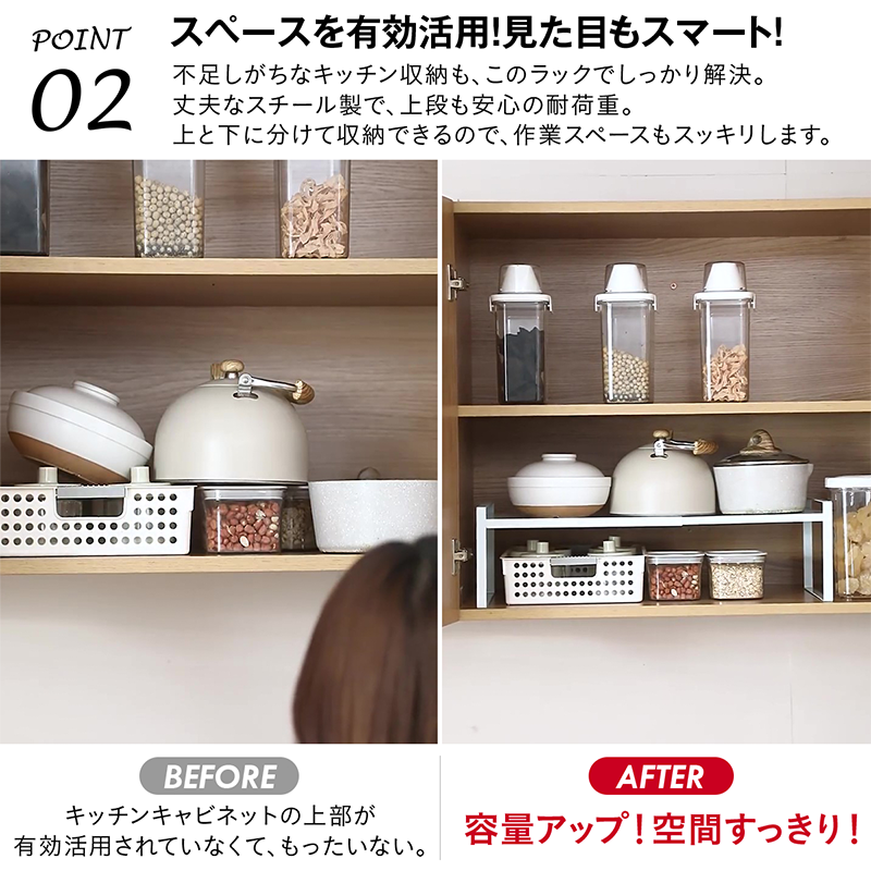 | 商品説明 | 幅2種類 25?45/35?65cmに伸縮できるカウンター下ラックです。キッチン下や洗面台下などに便利なラックです。置き場所に合わせて長さを調整でき、無駄な空間を賢く活用します。 奥行22cm、高さは17cm/高さ25cmの2サイズで、家電や食器の上にもすっきり収まります。 丈夫なスチール製で安定感があり、同型を重ねて容量アップも可能。 両サイドがオープンタイプなので出し入れしやすく、水拭きでお手入れ簡単。 ホワイト/ブラックの2色展開で、キッチンはもちろん洗面台やデスク周り、リビング収納にも幅広く使えます。 |
