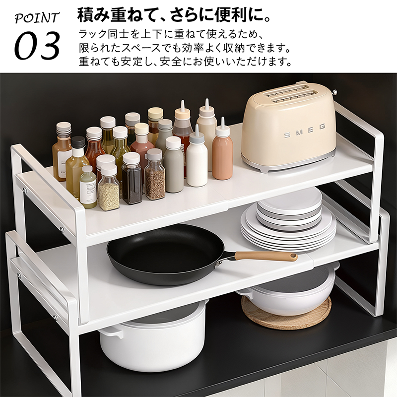 シンク下 伸縮ラック スチール製 スタッキングラック 伸縮棚 キッチン下ラック 洗面台 伸縮ラック 省スペース キッチンラック 隙間収納