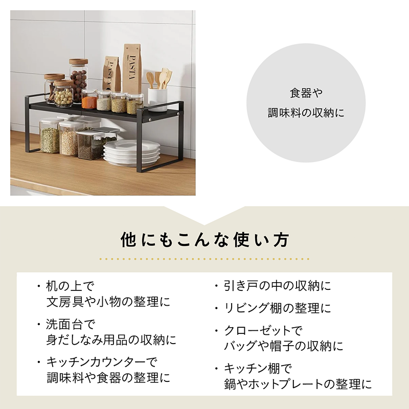 収納ラック キッチン収納 伸縮ラック 伸縮棚 キッチンラック 収納棚 食器収納 省スペース収納 スチール製ラック カウンター収納 戸棚収納 調味料ラック シンク周り収納 整理整頓 スタッキングラック ホワイトラック ブラックラック 棚板伸縮 2段ラック デスク上収納 洗面所収納 リビング収納 クローゼット収納 奥行22cm 高さ25cm |
